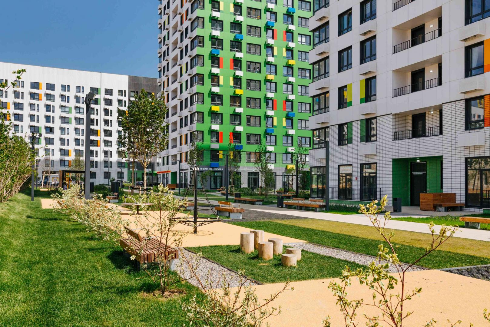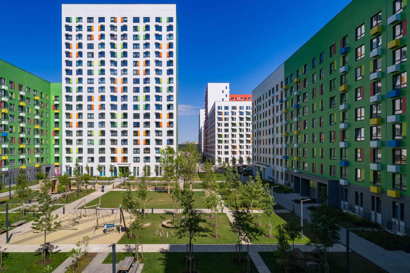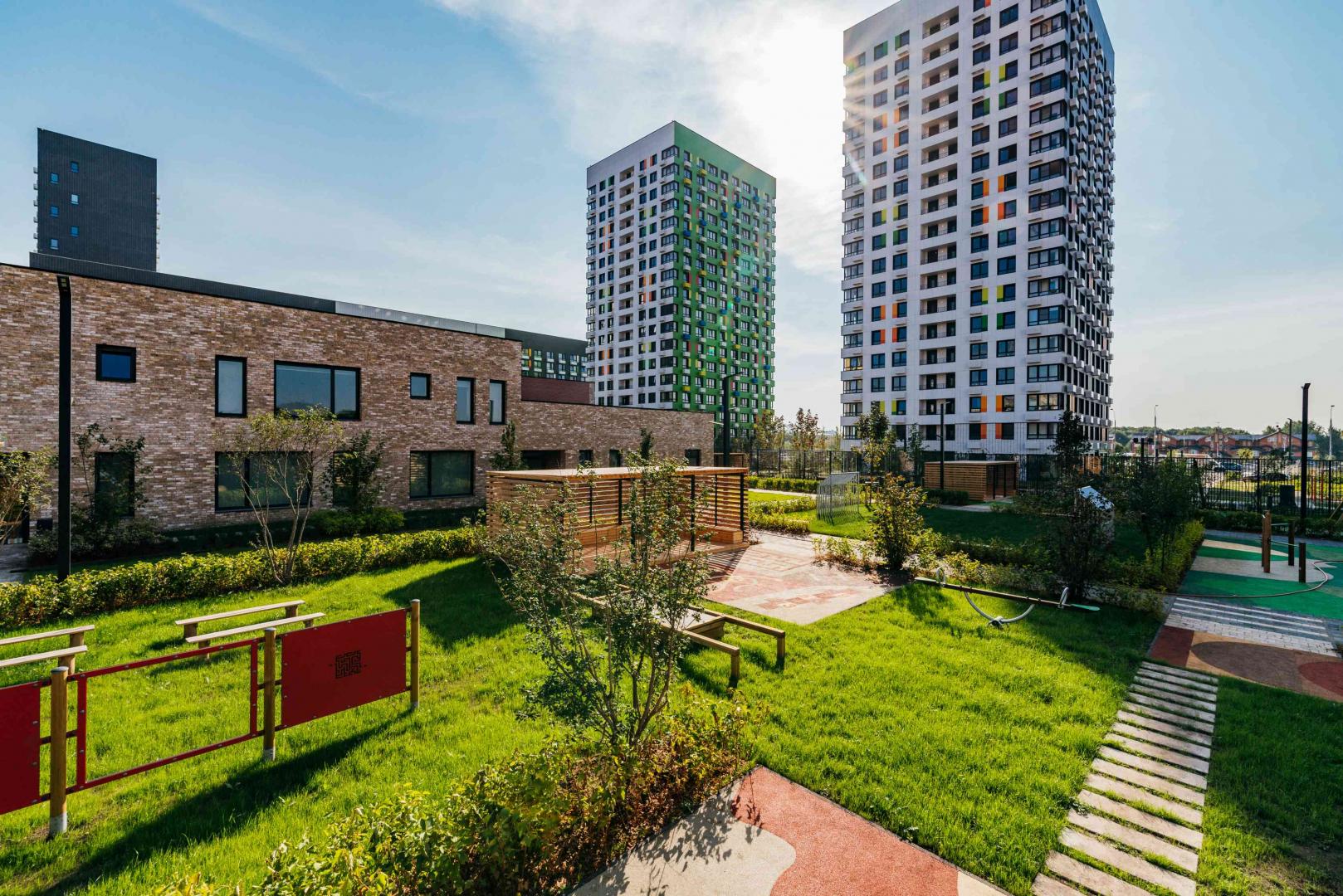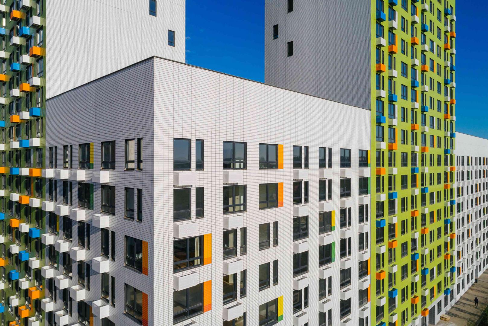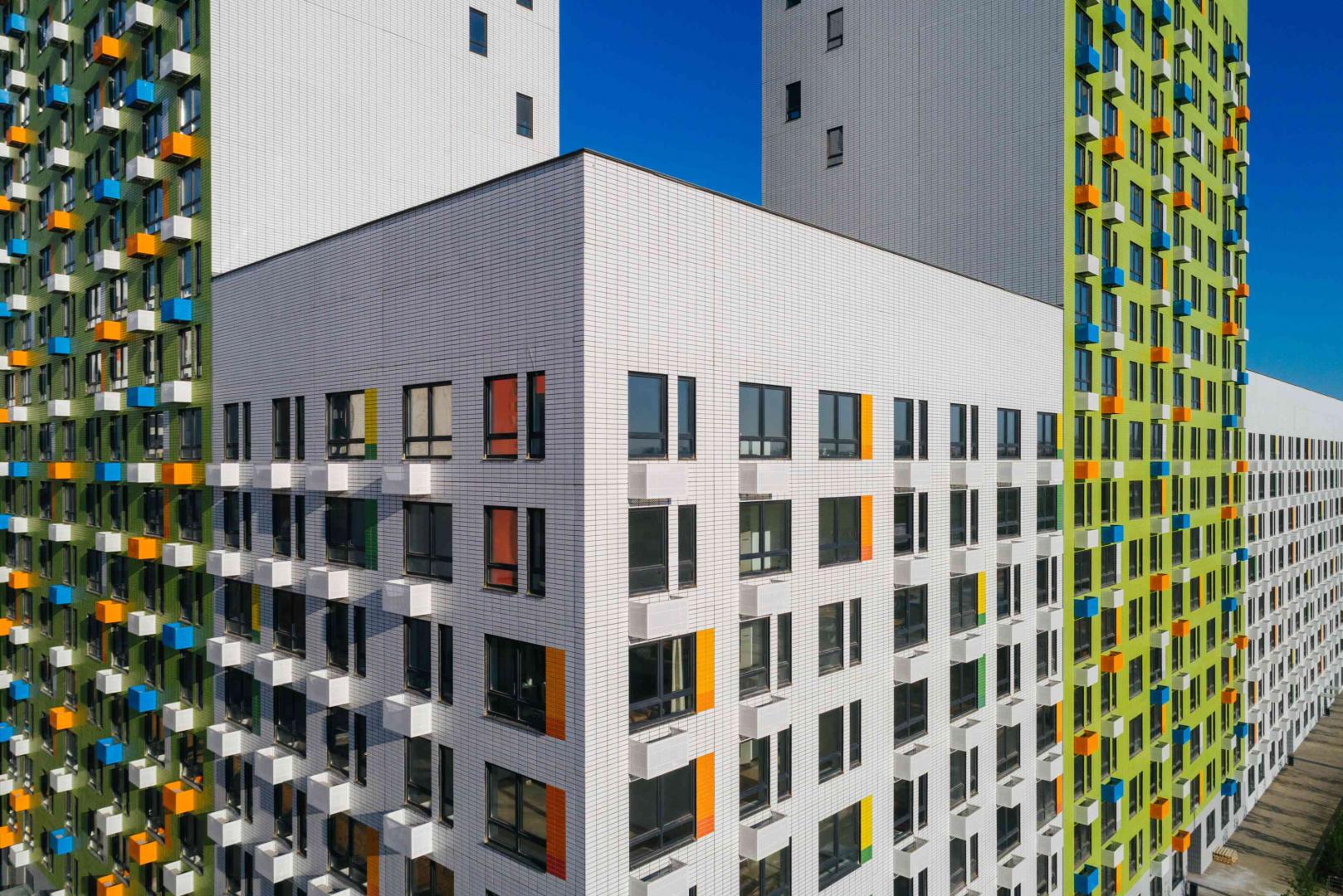 Данный проект глобален, он представляет собой 8 очередей строительства. Три из них уже введены в эксплуатацию, сдача остальных планируется до конца 2019 года. Здесь будет 19 жилых зданий эконом-класса различной этажности (9-18) и объекты инфраструктуры (паркинги, школа, детские сады, поликлиника). Внешняя отделка фасадов выполнена яркой зеленой и белой керамической плиткой. Расстановка домов спроектирована таким образом, чтобы сформировать закрытые, безопасные дворы, в которые машины въехать не смогут. Выходы из подъездов в две стороны: внутренний двор и внешняя улица. Все подъезды без ступеней, лестниц и пандусов, что является дополнительным удобством для жильцов. В каждом установлены пассажирский и грузоподъемный скоростные лифты с увеличенной кабиной. Есть комнаты для консьержа, а также помещения для хранения колясок и велосипедов.