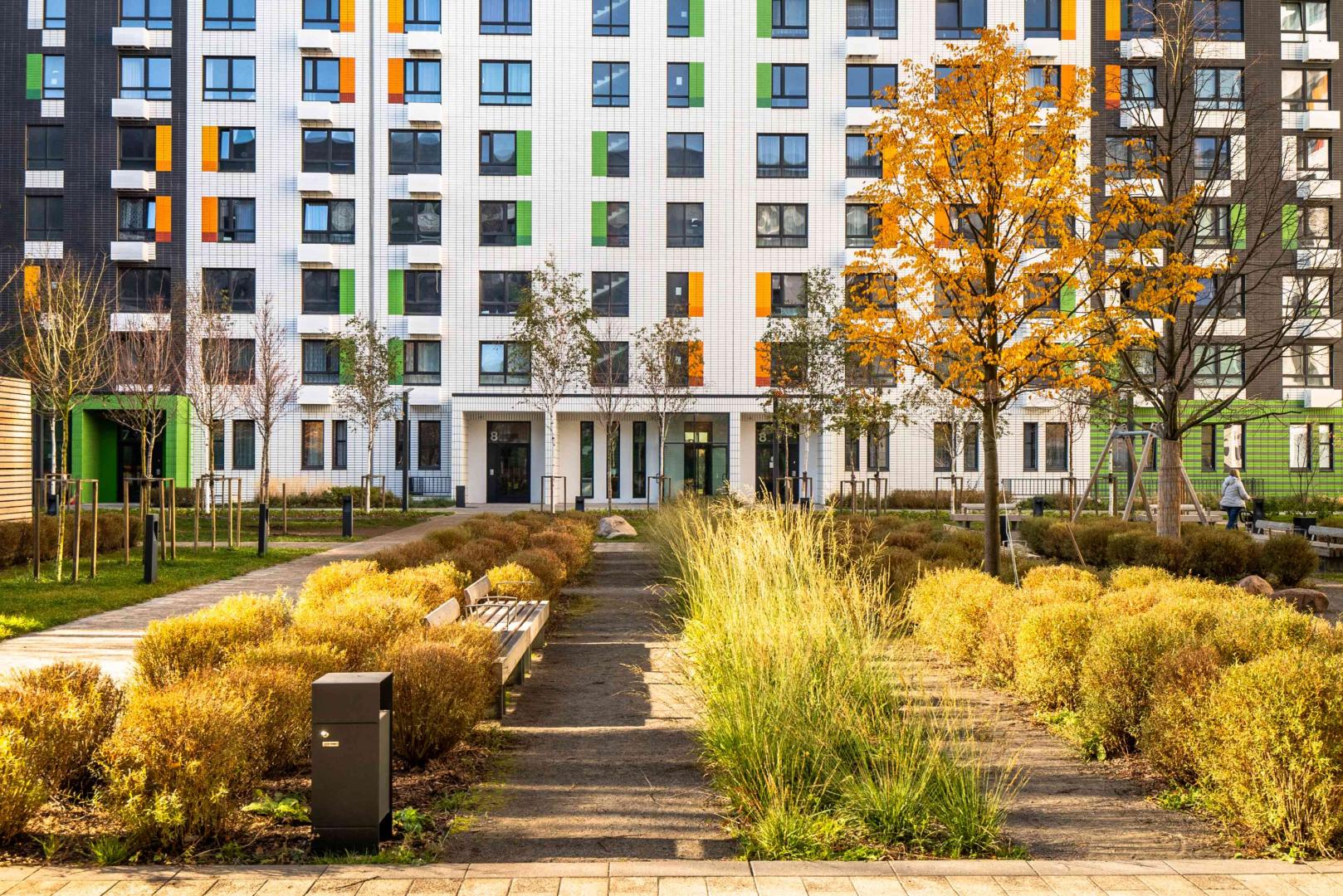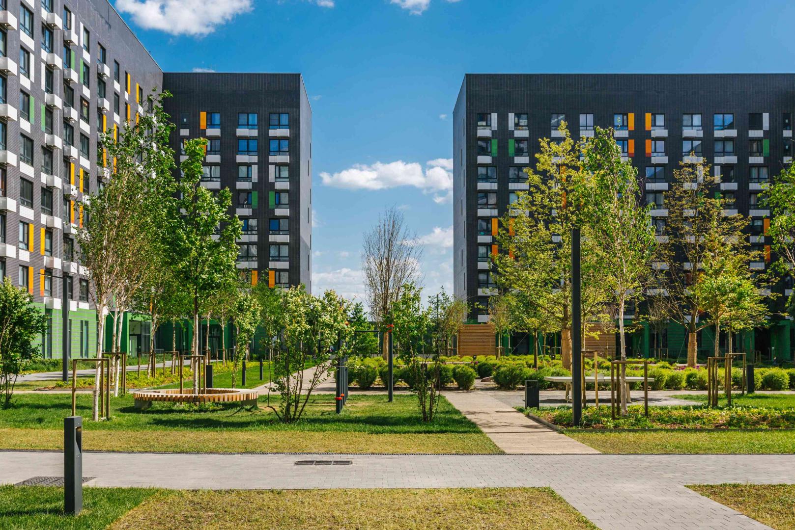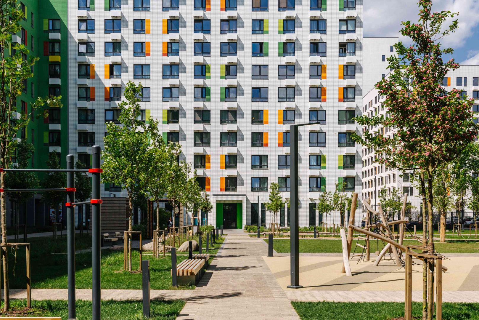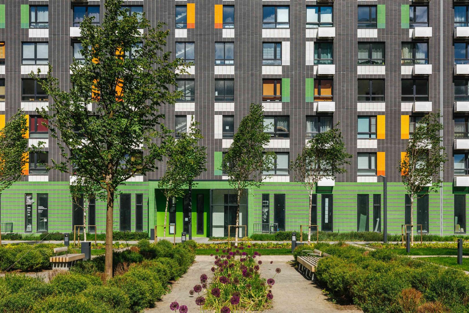 Данный проект глобален, он представляет собой 8 очередей строительства. Три из них уже введены в эксплуатацию, сдача остальных планируется до конца 2019 года. Здесь будет 19 жилых зданий эконом-класса различной этажности (9-18) и объекты инфраструктуры (паркинги, школа, детские сады, поликлиника). Внешняя отделка фасадов выполнена яркой зеленой и белой керамической плиткой. Расстановка домов спроектирована таким образом, чтобы сформировать закрытые, безопасные дворы, в которые машины въехать не смогут. Выходы из подъездов в две стороны: внутренний двор и внешняя улица. Все подъезды без ступеней, лестниц и пандусов, что является дополнительным удобством для жильцов. В каждом установлены пассажирский и грузоподъемный скоростные лифты с увеличенной кабиной. Есть комнаты для консьержа, а также помещения для хранения колясок и велосипедов.