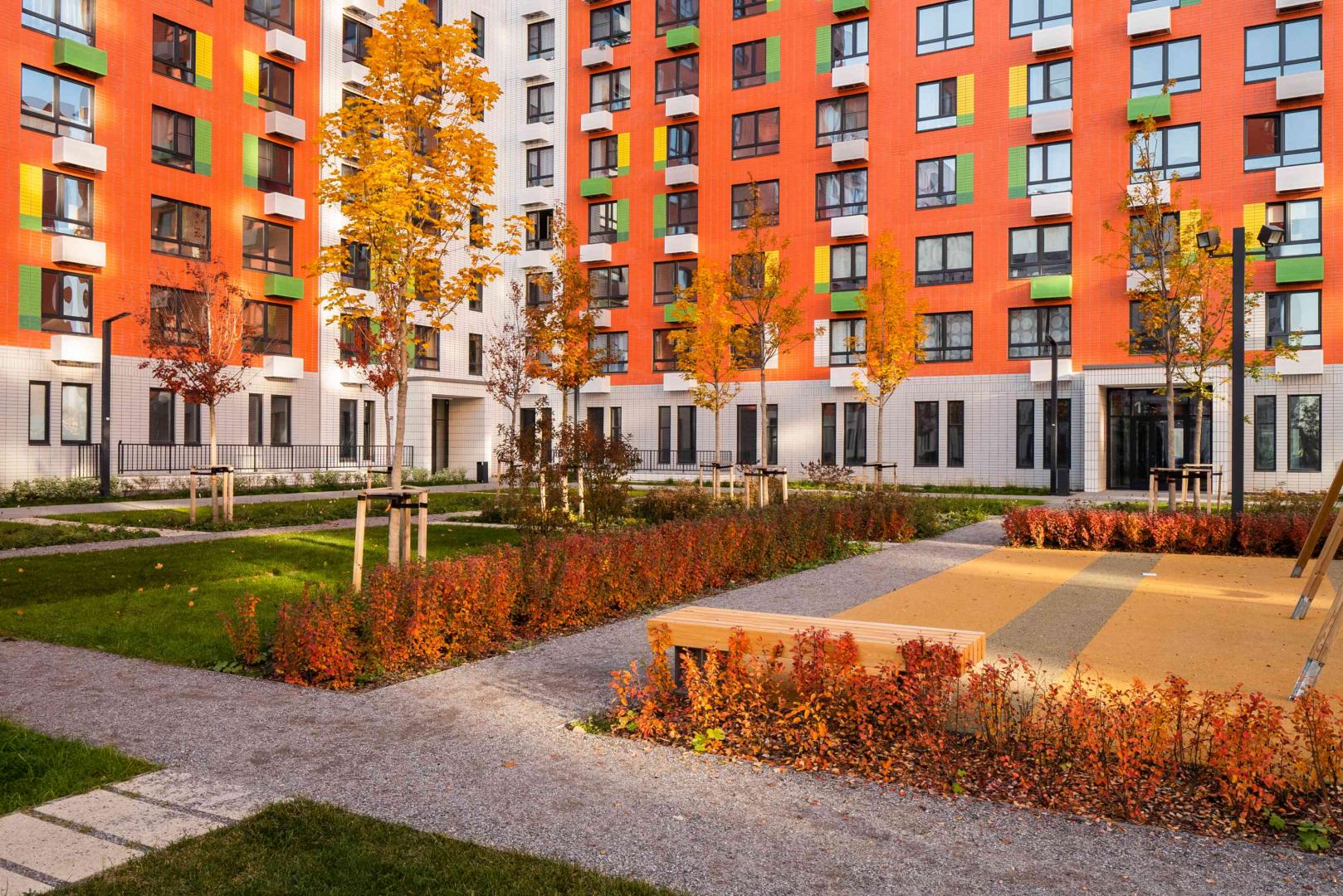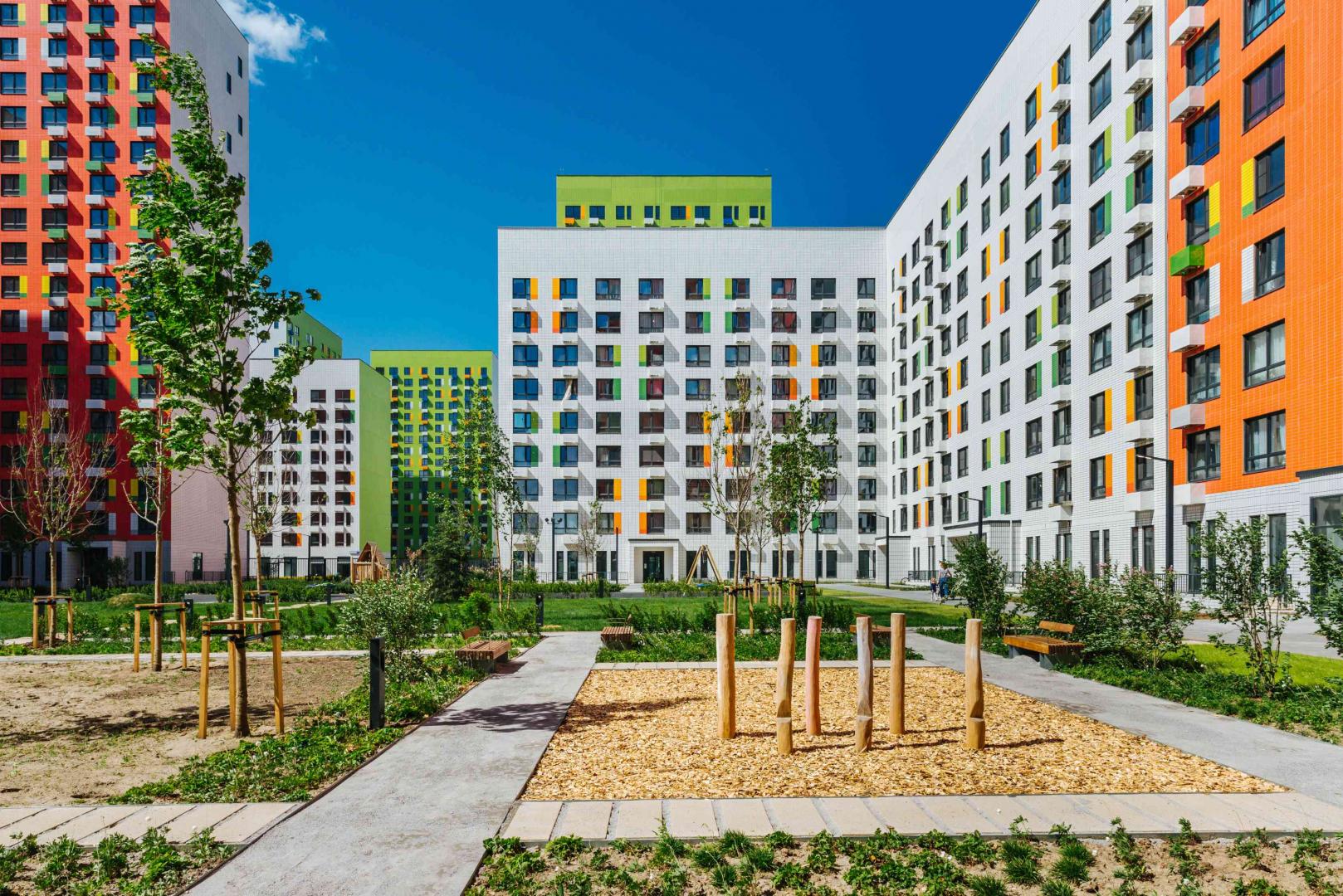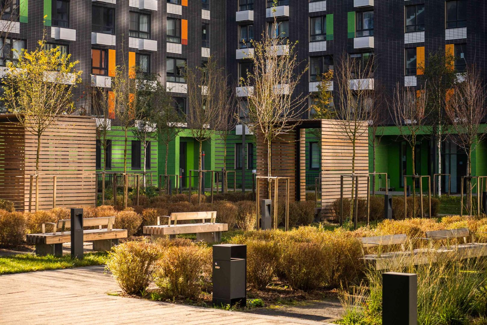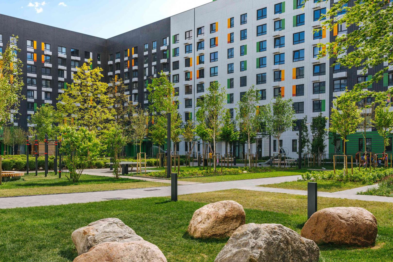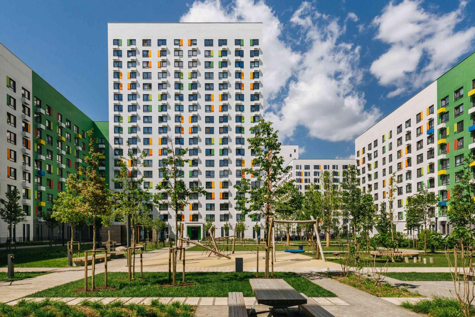 Данный проект глобален, он представляет собой 8 очередей строительства. Три из них уже введены в эксплуатацию, сдача остальных планируется до конца 2019 года. Здесь будет 19 жилых зданий эконом-класса различной этажности (9-18) и объекты инфраструктуры (паркинги, школа, детские сады, поликлиника). Внешняя отделка фасадов выполнена яркой зеленой и белой керамической плиткой. Расстановка домов спроектирована таким образом, чтобы сформировать закрытые, безопасные дворы, в которые машины въехать не смогут. Выходы из подъездов в две стороны: внутренний двор и внешняя улица. Все подъезды без ступеней, лестниц и пандусов, что является дополнительным удобством для жильцов. В каждом установлены пассажирский и грузоподъемный скоростные лифты с увеличенной кабиной. Есть комнаты для консьержа, а также помещения для хранения колясок и велосипедов.